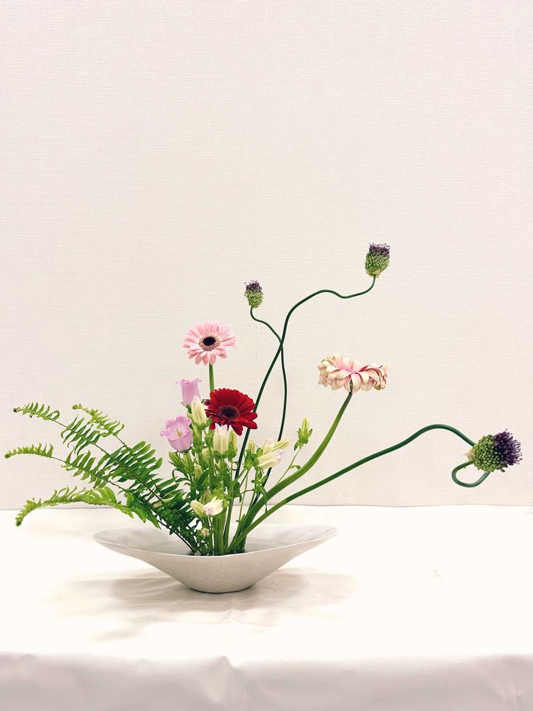 そこに曲線状のガーベラの位置を正していただいて面白い作品が出来上がりました😊🎶🎶