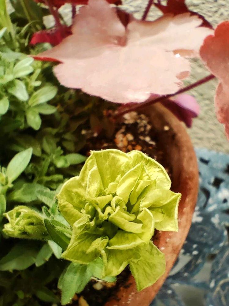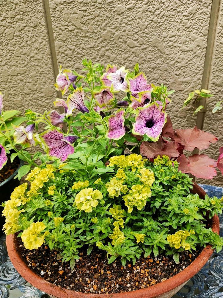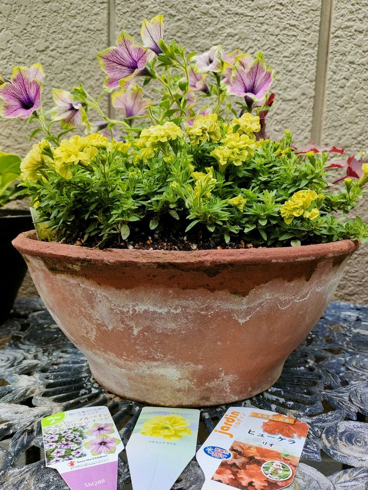 2️⃣先日ワタシの健康ランド(HC)で寄せ植えの相棒を厳選😆👍グリーンエッジがペチュニアライムと合いそうな背丈のあるペチュニアと、赤い葉がオシャレなヒューケラに決定‼️
