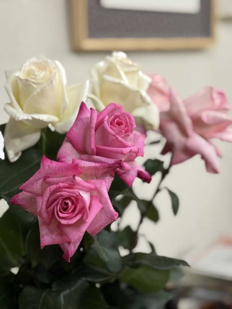 中央は、ザ フェアリーなのですが、白とピンクの源平咲き⁈のように咲いてます💕まだ咲いてませんが、右の手前にはスイートチャリオット🌹も。