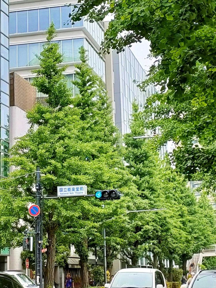 5️⃣千駄ヶ谷駅から右に進むと国立能楽堂の信号が。この辺りの銀杏並木が好きです💚