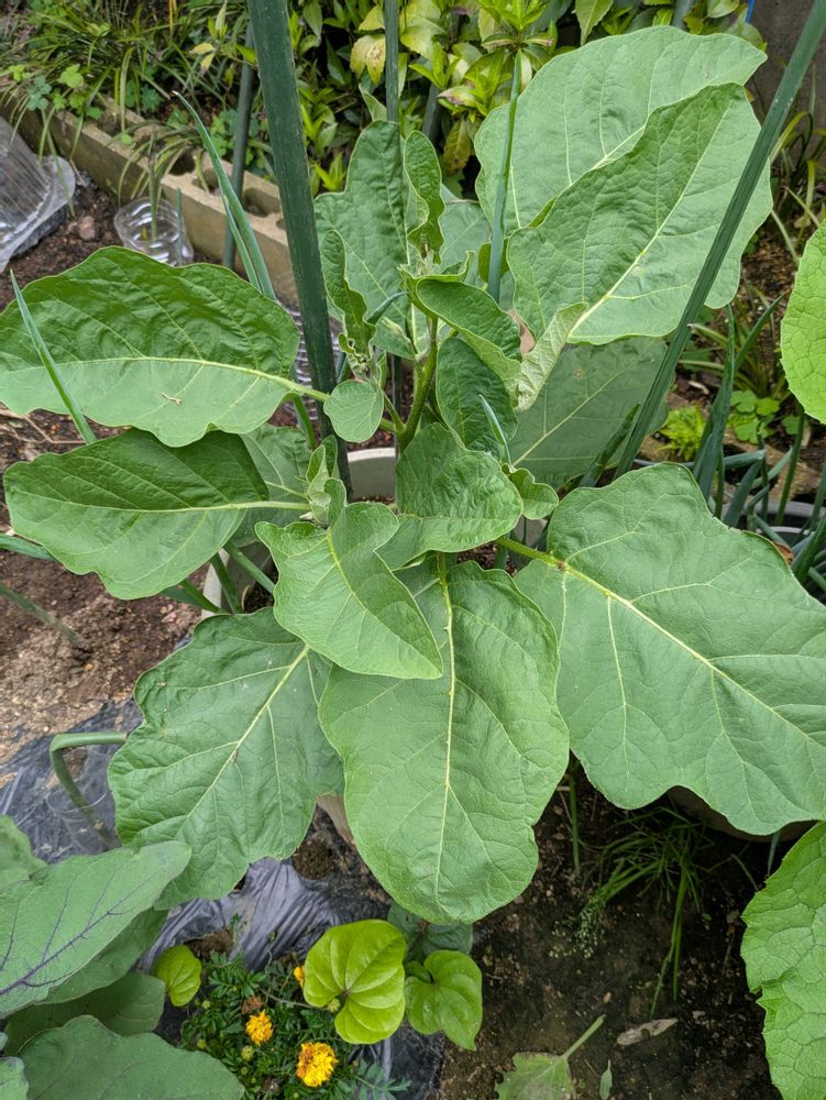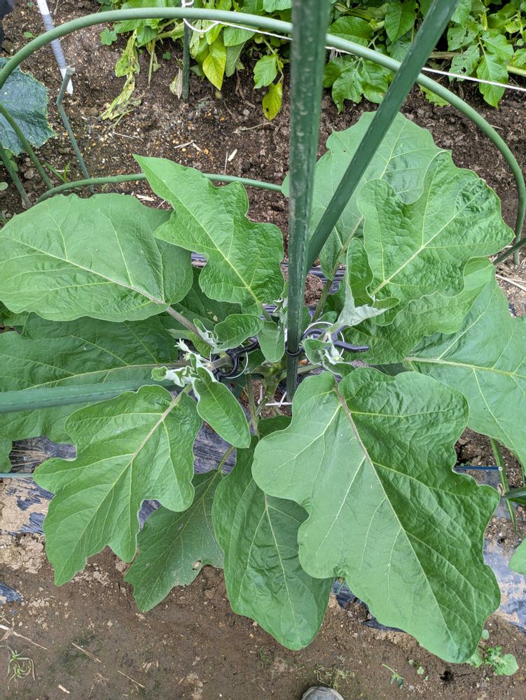 埼玉伝統野菜の青大ナスです、葉や茎にトゲがあり栽培する農家さんが少なくなったと言われます
