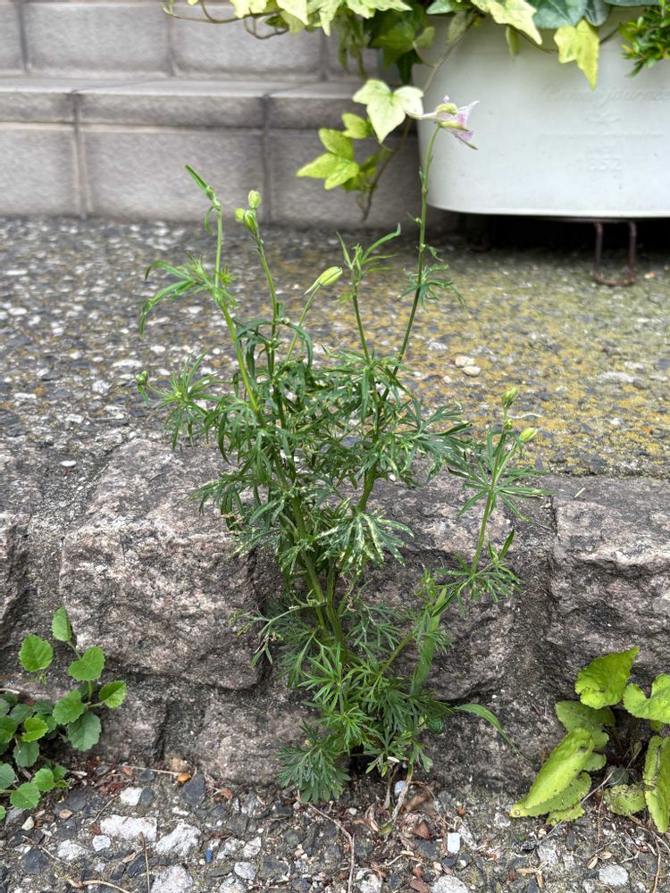 玄関のコンクリートの割れ目、丁度階段の真ん中なので伸びては先が折れて、又折れてですが花が咲きました