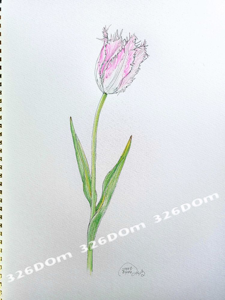 縁のギザギザがユニークなチューリップ。色は白とピンクの組み合わせ、一輪挿しにしたら素敵だと思います😊