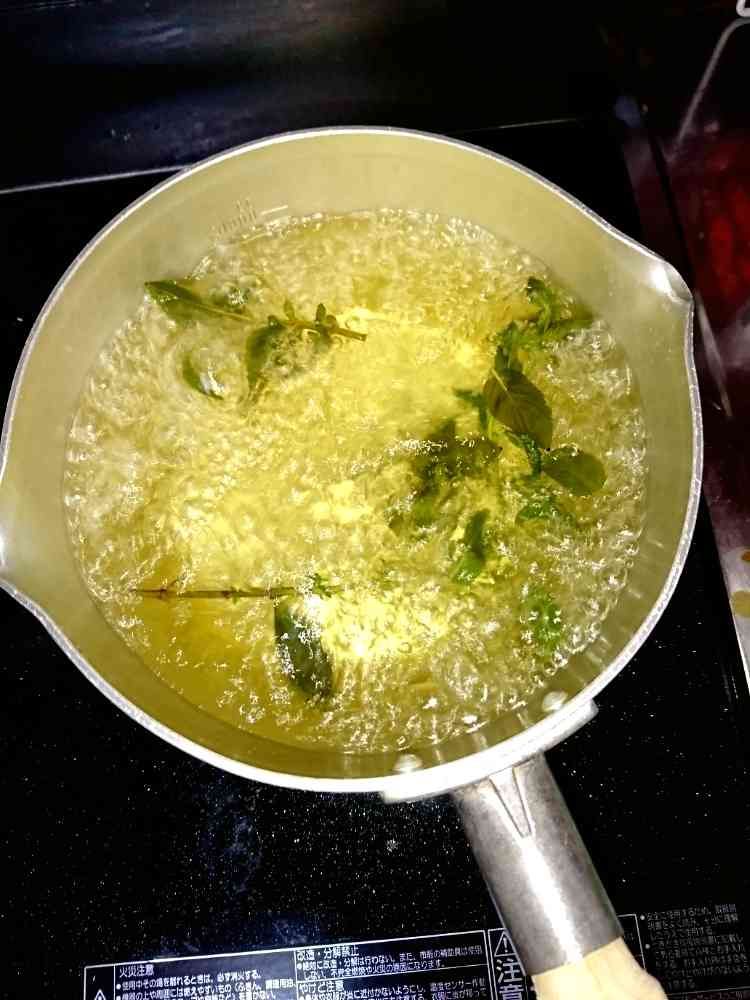 本当にただ、「収穫したペパーミントを適当にお湯でたぎらせ、熱がとれたもの」を水やりや床掃除に使いました。