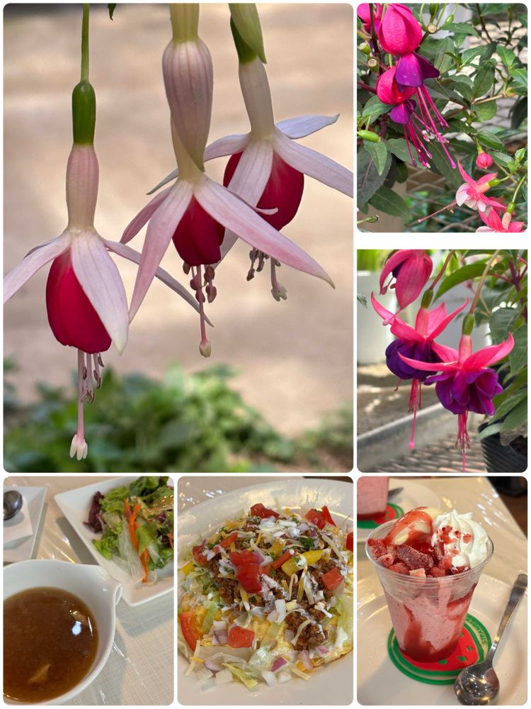 上側のpicのお花どちらとも綺麗ですね💕気に入りなっているお花です🌸お高いですか?ランチも美味しそう🍽️お腹空いてきました😆サラダとご飯の上に色々乗っているのですね。ちらし寿司ではないのかな?いや?洋風?それとスイーツもはアイス?🍨🍹