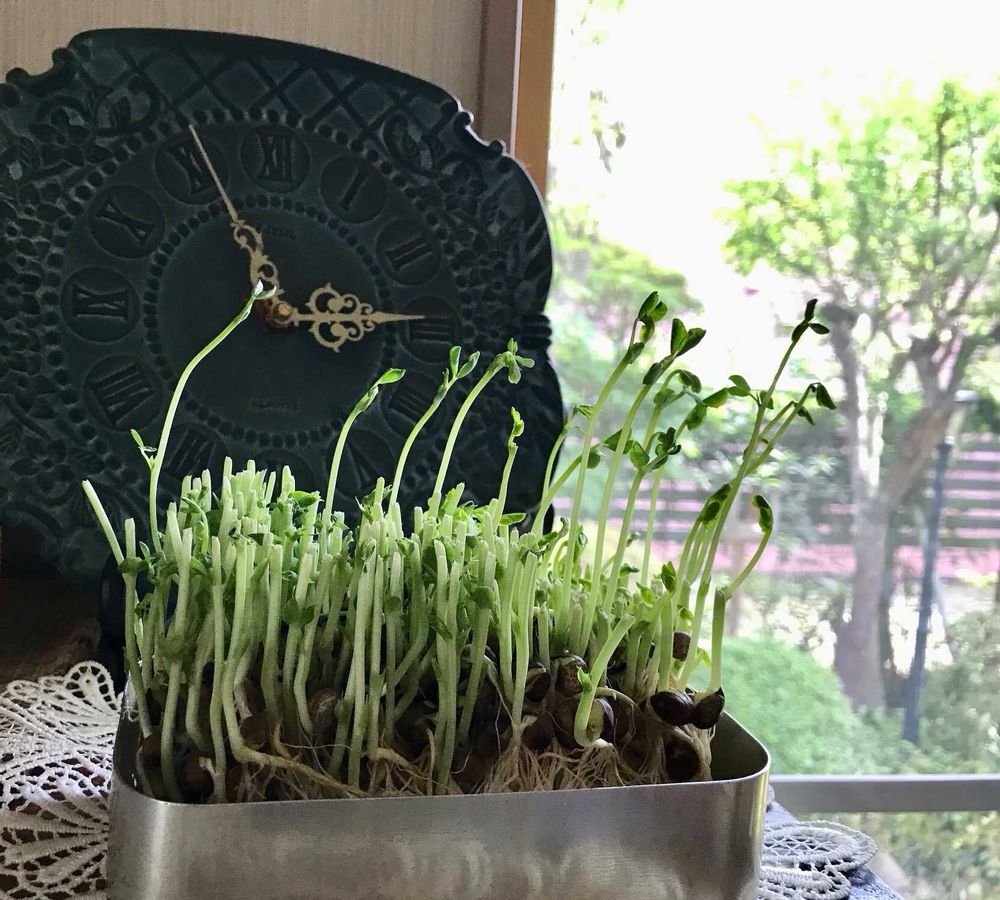豆苗の第2段!増産を狙って北向きのキッチンから南向きの窓辺に移動………気が付けばみんな太陽の方を向いてる☀️ 🤣🤣🤣