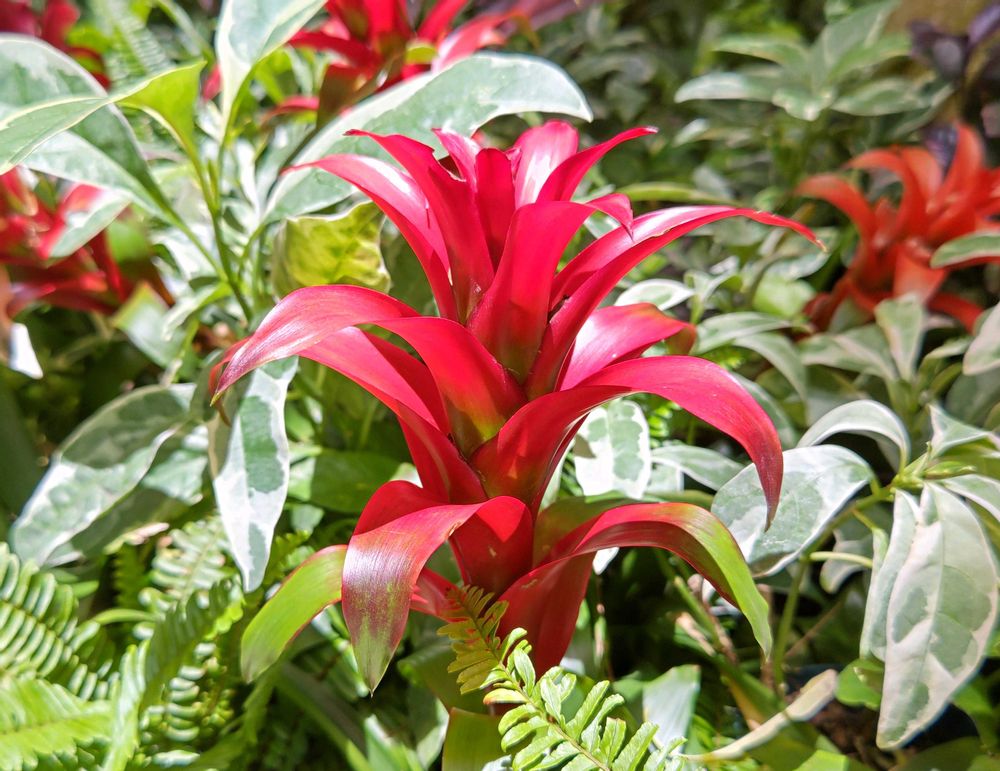 私はグズマニアは温室育ちしか見たことがないから、南国の太陽の光を浴びると、本当に色艶が違うなーって思いましたよ😃