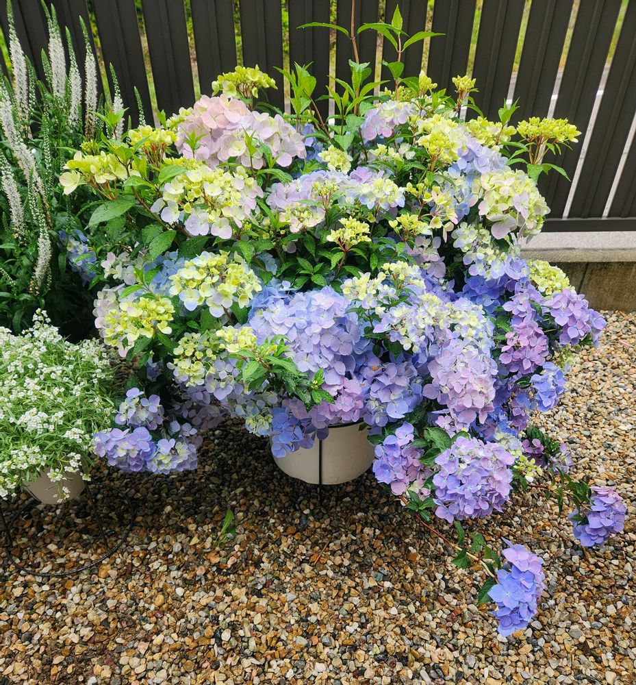 昨年花苗は青色だったので、1年間赤色アジサイの土と肥料を施してみました。紫ピンクになったかな😊