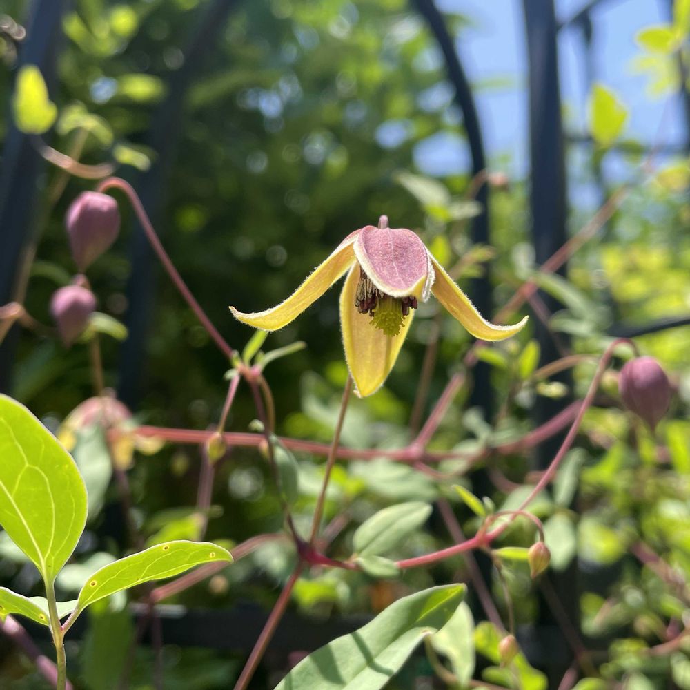 ②ベル型四季咲き 品種不明の昨年5月に購入したクレマチスの花が咲きそう。