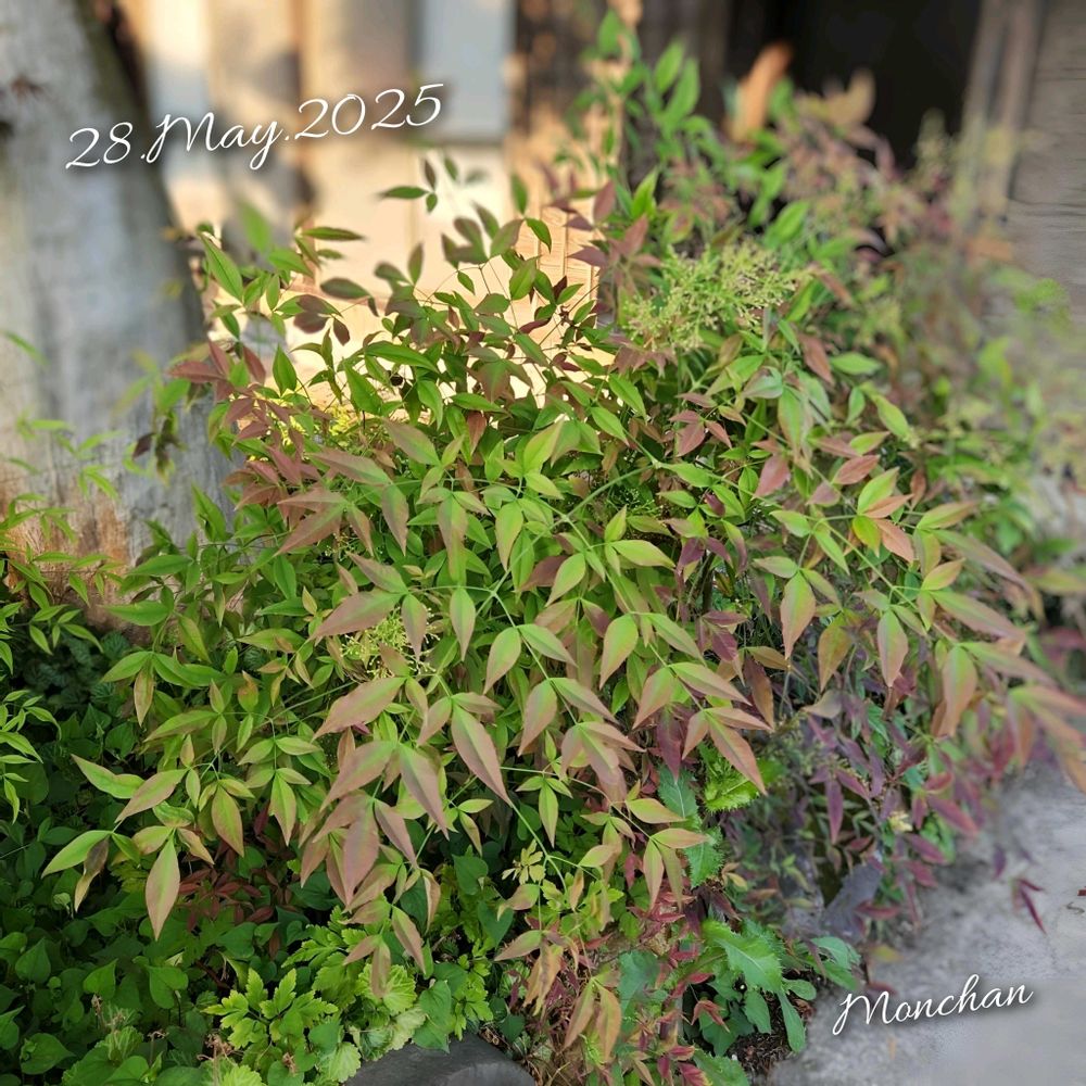 南天の向かって右にある、総丈30㎝強のかわいい低木庭木です😊