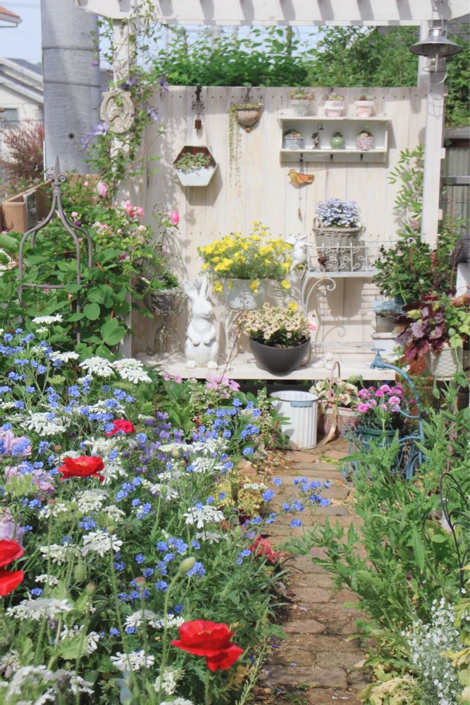 小さな庭に、ブルーのシノグロッサム、オルレア、赤いポピーが☺️