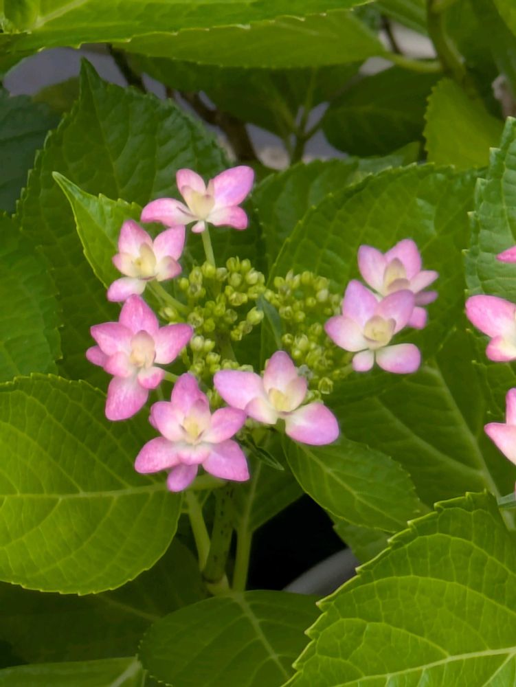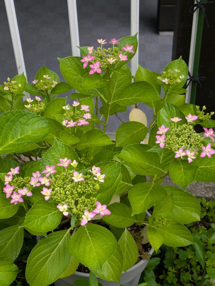 アジサイ ダンスパーティー 地植えすると家では酸性の土で、青くなってしまうから、掘り上げて挿し木したものを、培養土で植木鉢です。