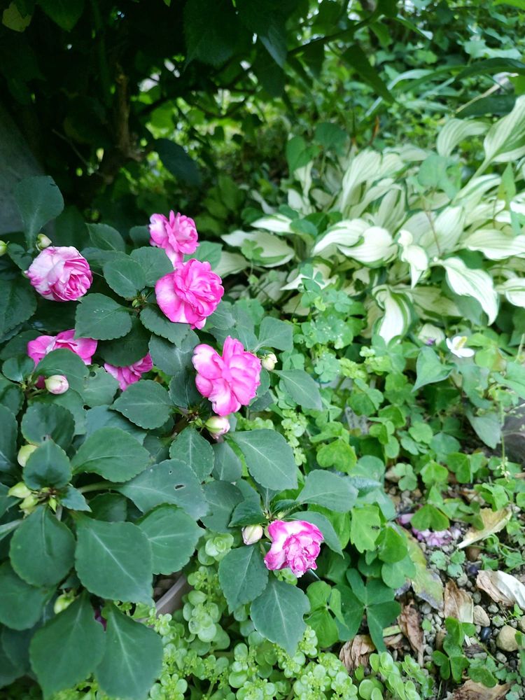 紫陽花の下で過ごしやすそうなインパチェンスとギボウシです(◍•ᴗ•◍)❤