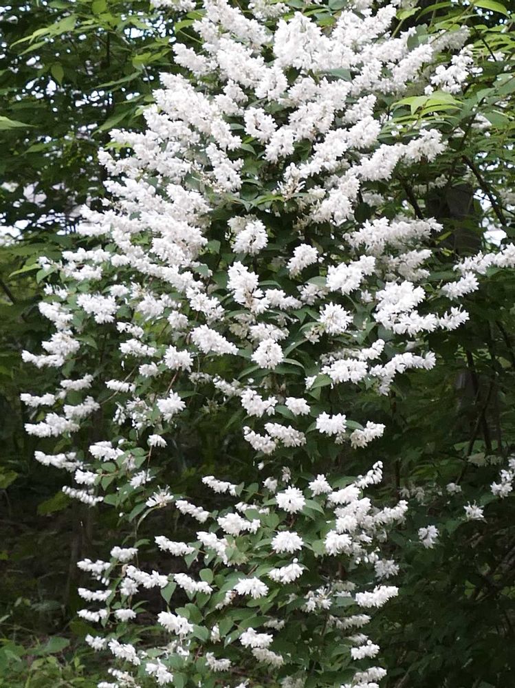AI 君は「ヒメウツギ(姫空木)」と言っていましたが、高さが2メートル以上あるので「シロバナヤエウツギ(白花八重空木)」ではないかと思います🧐