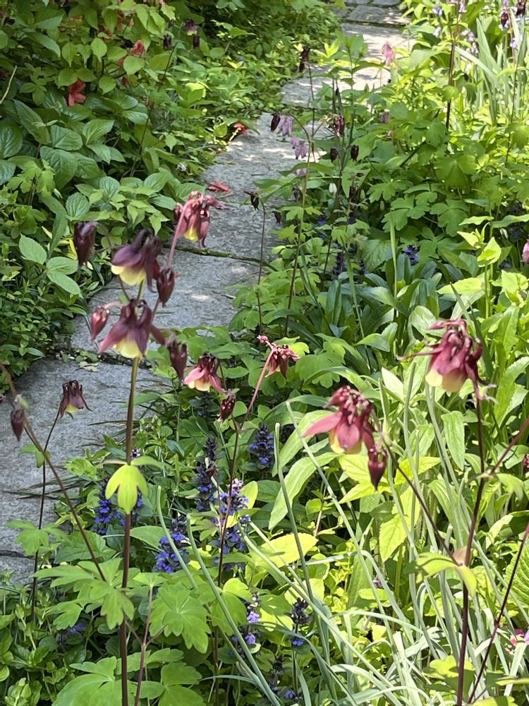 セイヨウオダマキの溢れ種で庭のあちこちに芽を出して花が咲き出しました