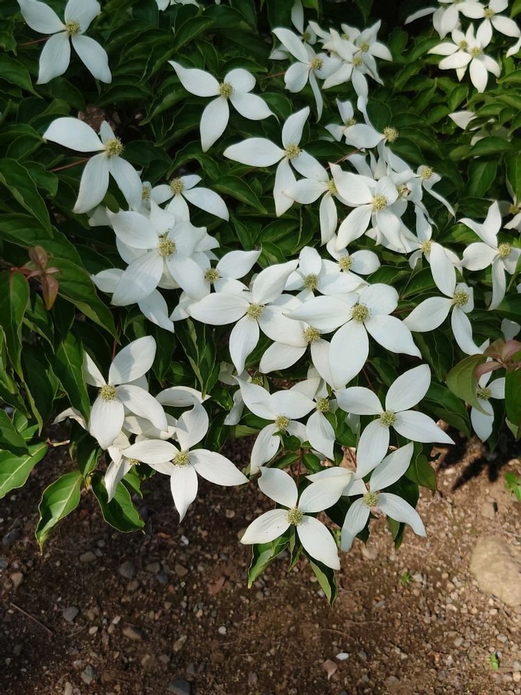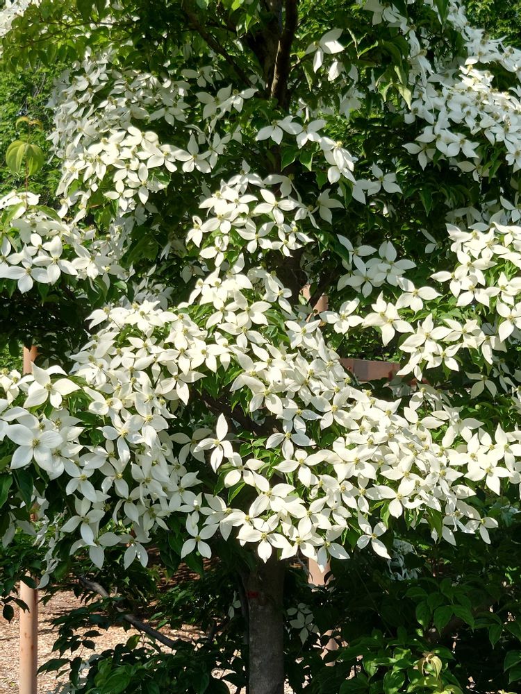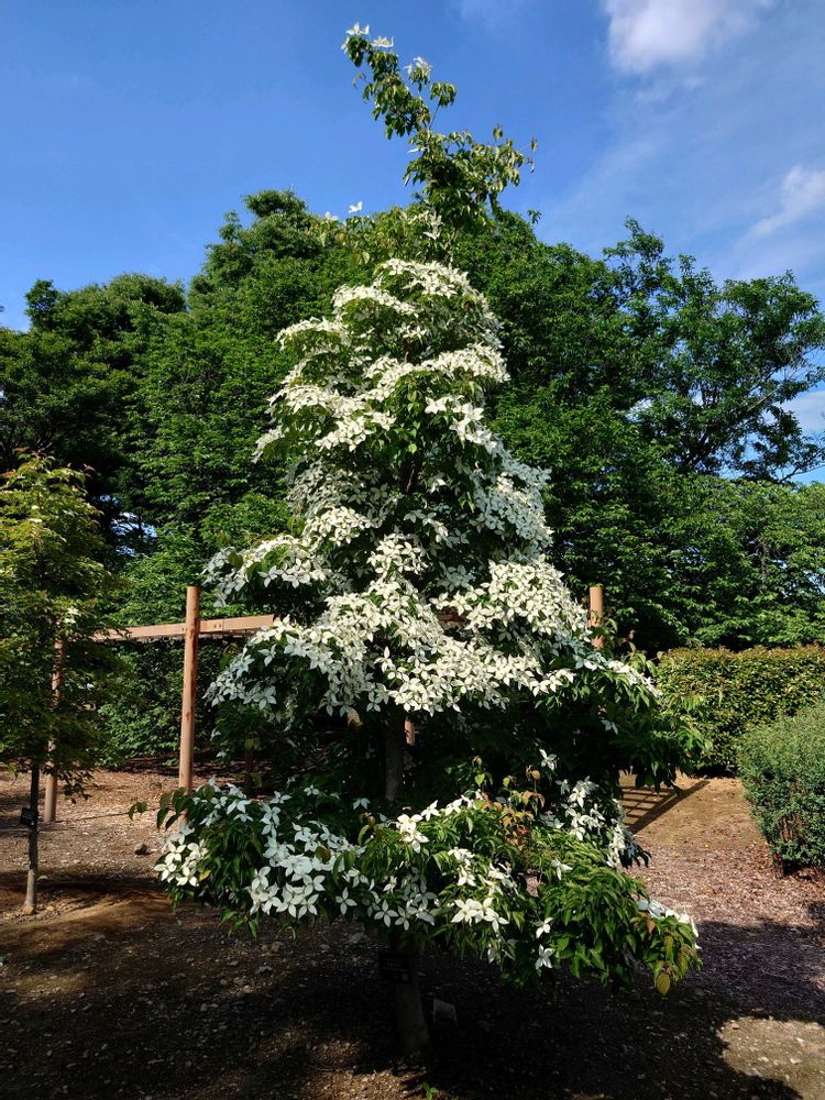 するとすると! 木の先っぽが天まで届いています🙄😀 ちょっと古いですけど、「青天を衝け」ですね🤭 それにしても雪がかぶったようなこの花数はみごとです👏👏👏 手裏剣のような花形もかっこいいヤマボウシです🥷(農業試験場内にて)