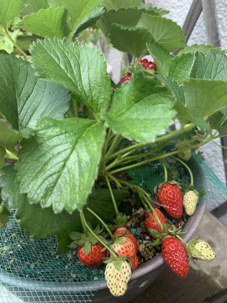 今朝、ベランダを見ると赤い花の🍓が何個か食べられそう