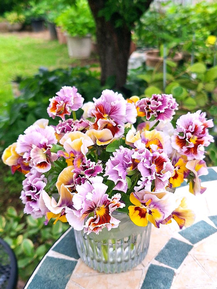 ③もうすぐ5月が終わるというのに、頑張って咲いていたパンジーをカットして飾ってみました🎵