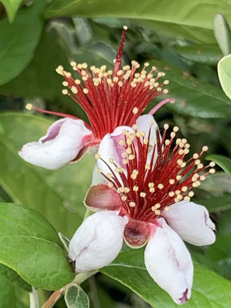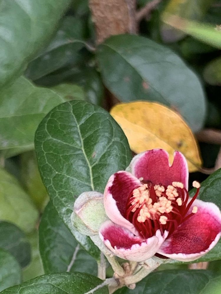 今日の朝、いつの間にかフェイジョア🩷💚の花が咲いていてびっくり‼️しました。