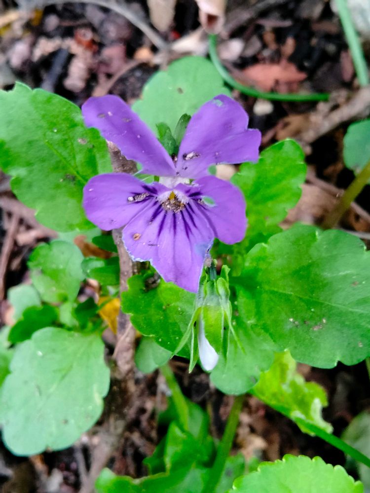 日陰の枯葉の中でちっさい菫、食べられた痕?がんばれー!