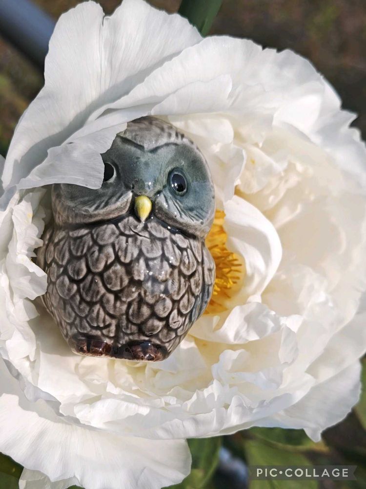 陶器のフクロウが乗せられるなんて、しっかりした花ですね〜!