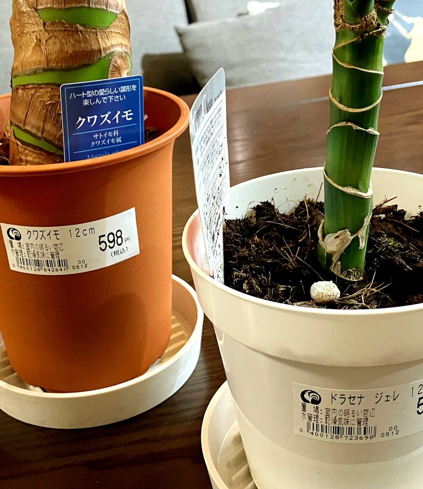 良き鉢に出会えたらお迎えしようと思っていたクワズイモが、今日のホムパトで運命の出会い🪴お手頃な¥598で立派なサイズだったので物色していると、¥598商品がよりどり2鉢で¥900のSALEになってるじゃありませんか‼️🥳しかも税込‼️ちなみに、ガジュマル、ディフェンバキアカミーラ、ユッカエレファンティベス、テーブルヤシ、セローム、ダリア、パキラ、クワズイモ、ドラセナジェレがどれも4.5号鉢くらいのそこそこ良きもので¥598の対象品に‼️悩んだ挙句、クワズイモとドラセナジェレをお迎えさせていただきました🪴🪴🥳