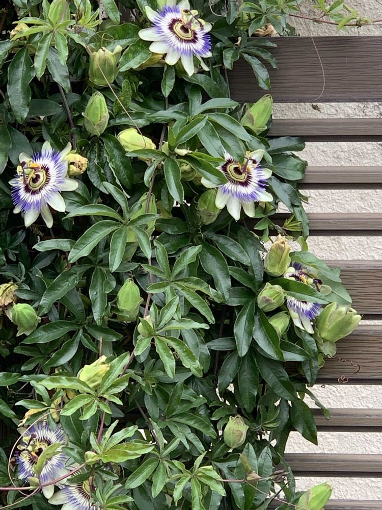時計草さん🕐どこが根元か?もはやまーったく、わからなく、茂っています😆ちょっと刈らなくてはと思うのですが、どこからカットすれば良いのか、もつれまくっています😆