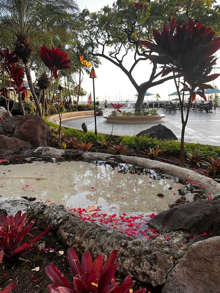 さん、はい、花びらの敷かれた橋から、風で揺れる浮き花に目を留めて、海と空をバックにその瞬間のトキメキなような自然界の優しく穏やかな時間に、胸キュンです(それに無料です☺️)🌺アローハッ🌺