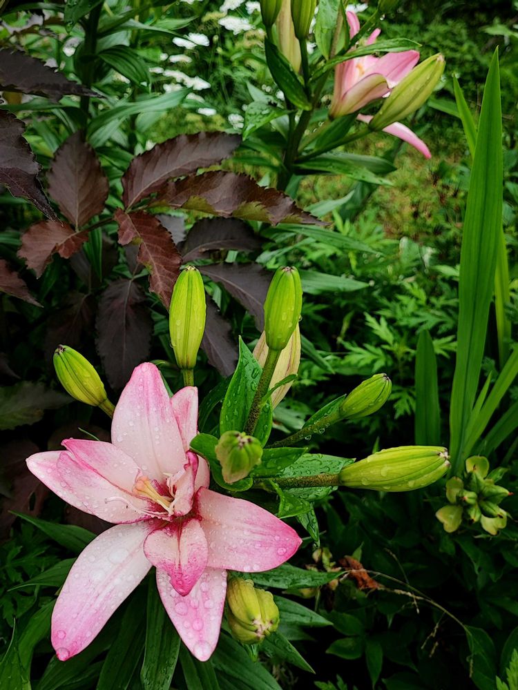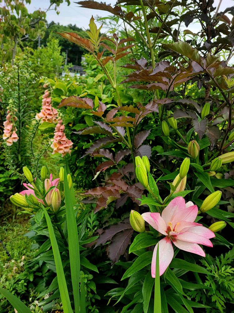 ピンクのスカシユリが開花しました。八重&爪紅なのでベントレーですね。去年もよく咲いたけど、今年は中央に植えた黒葉ニワトコが大きくなったので、淡い色が引き立って非常に魅惑的です。めちゃくちゃいい感じで胸がギュンギュンします。
