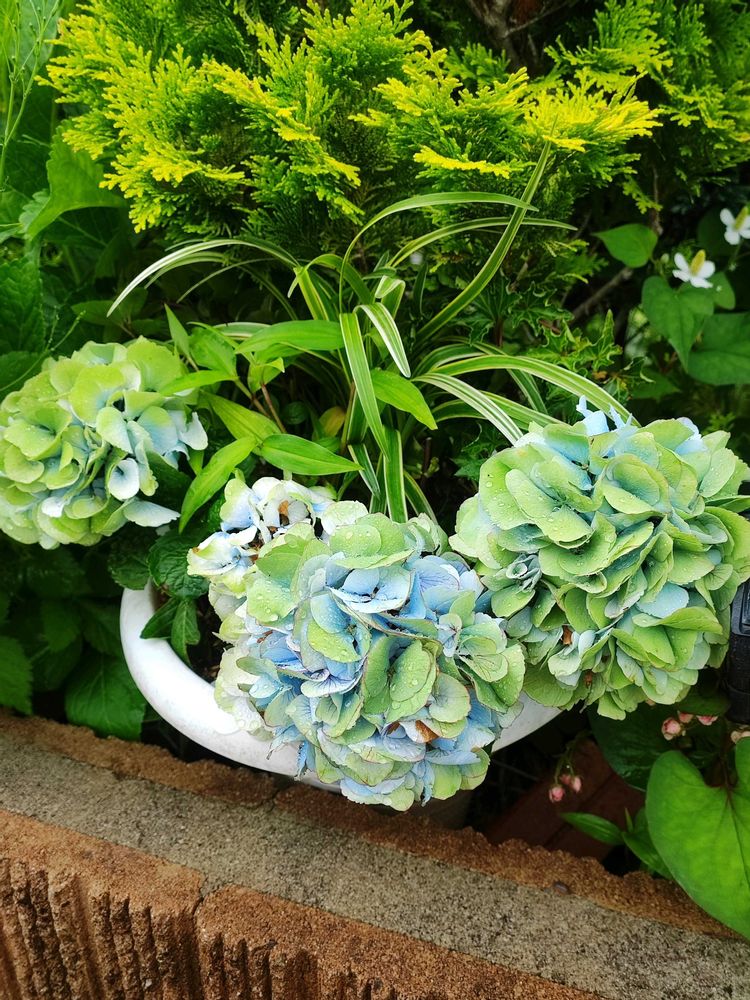そしてまた昨日は近所のコメリに値下げ品のハンティングに行きまして(アジサイの鉢物が半額とかになってたのを先週見てたので)、500円の紫陽花(4号鉢物/底面給水)をゲットしてきました。2株植えだったので分けて広げて寄せ植えにしました。黒軸、大輪手毬咲き、糸ピコ覆輪、秋色カラーと、なかなかポテンシャル高そうな感じの子なので来年以降がまた楽しみです。