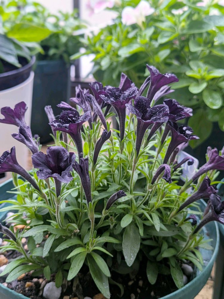 此方 今❗️ペチュニアの花色が好きで 何種類か 育て中〜何故かナメクジが花びらを齧りスプレー散布対策して 綺麗に咲いて嬉しい😆です🎶 がよちゃんの投稿・ペチュニアテヌートは スラリとした姿〜まだ出会え無い😔花のサイズは 小さめなのかなぁー⁉️ 気になる〜ガーデンマルシェに探しにg o❣️😙🛵💨