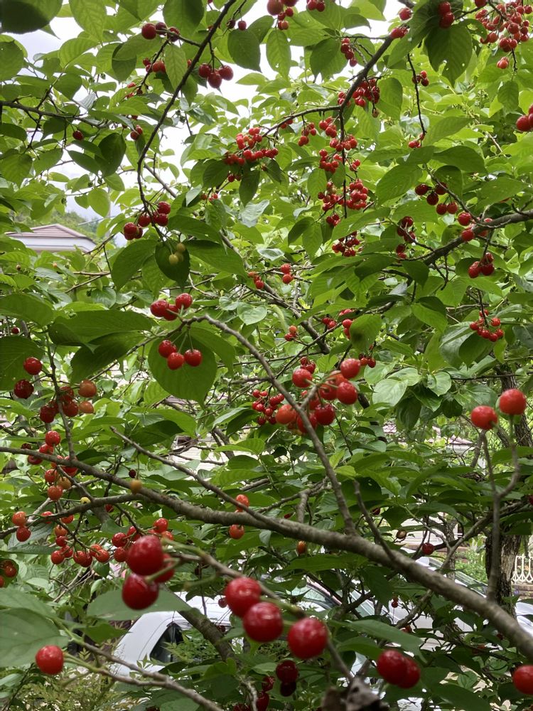 庭のさくらんぼ🍒が、ぎっしり赤かなり,手の届が無い所は、小鳥さんにあげます‼️😅 内孫達にどうかなぁ⁉️と尋ねたら断られガッカリ😞 落ちる実もいっぱい😥