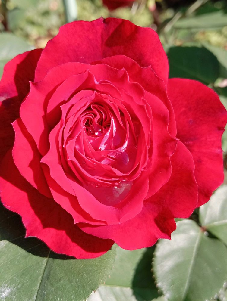 真っ赤な情熱の薔薇さん、アップのお顔が美しい〜🌹