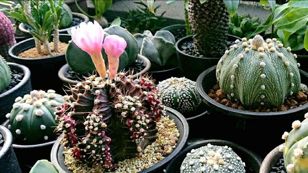 サボテン科 ギムノカリキウム属 牡丹玉と、アストロフィツム属 兜丸(濃赤花)😸😸