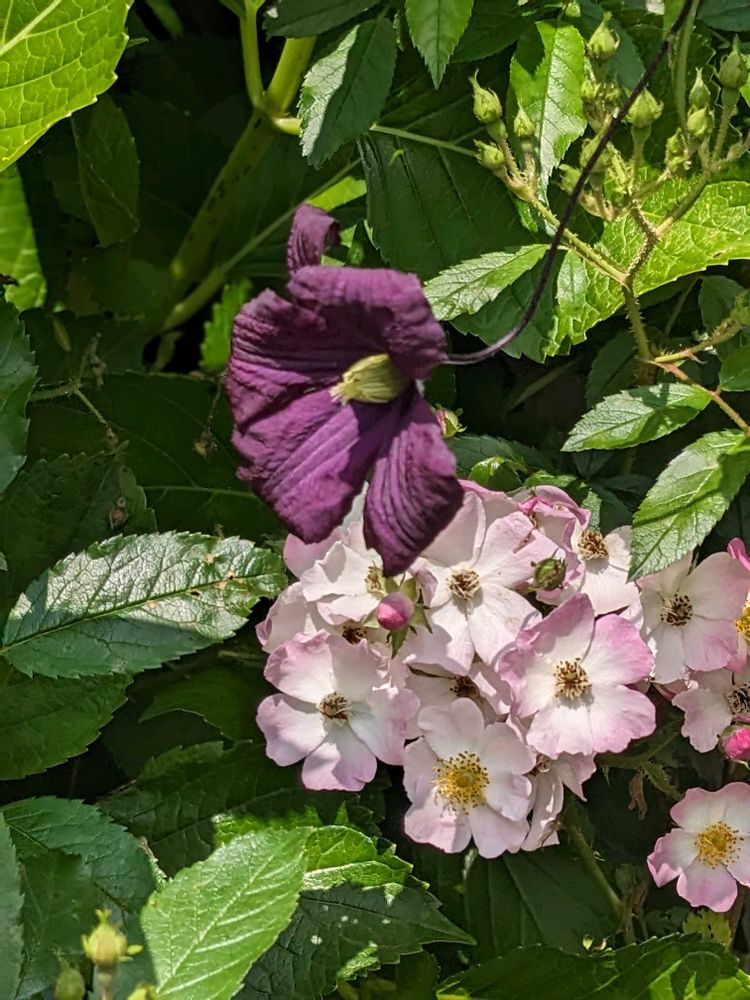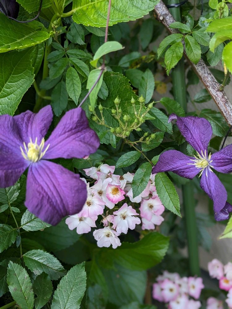 我が家の💚ツル薔薇 バレリーナ🩷と💚クレマチス エトワールバイオレット💜が一緒に咲いています🤗
