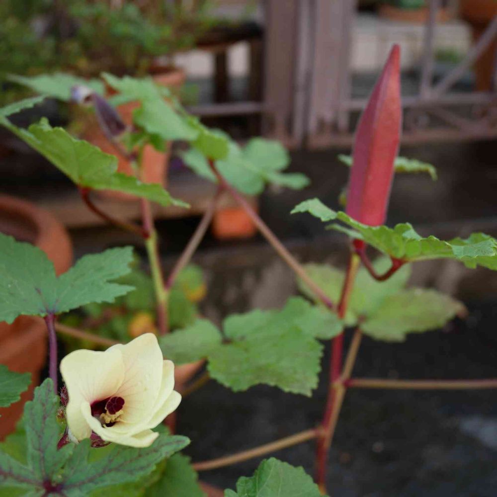 赤いオクラって初めて見ました💛お花は同じレモン色なんですね(*´꒳`*)