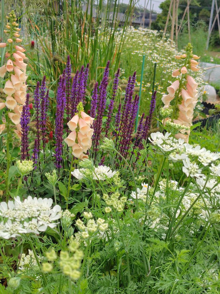 畑のお花スペース…今年はオルレアが爆咲きしてしまって宿根草を覆ってます😅