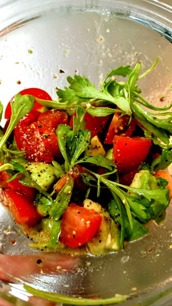 トマト、アボガドのハニーマスタードドレッシングサラダに、サラダ春菊を入れてみた✨