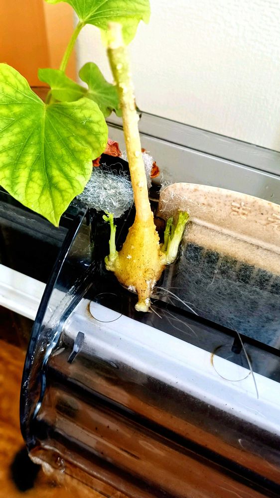 諦めていたのですが、土をほっくり返してみたらば、根っこら辺はいけるんじゃ?ってな姿を見たので、水槽のフィルター付近に置いてみたら、