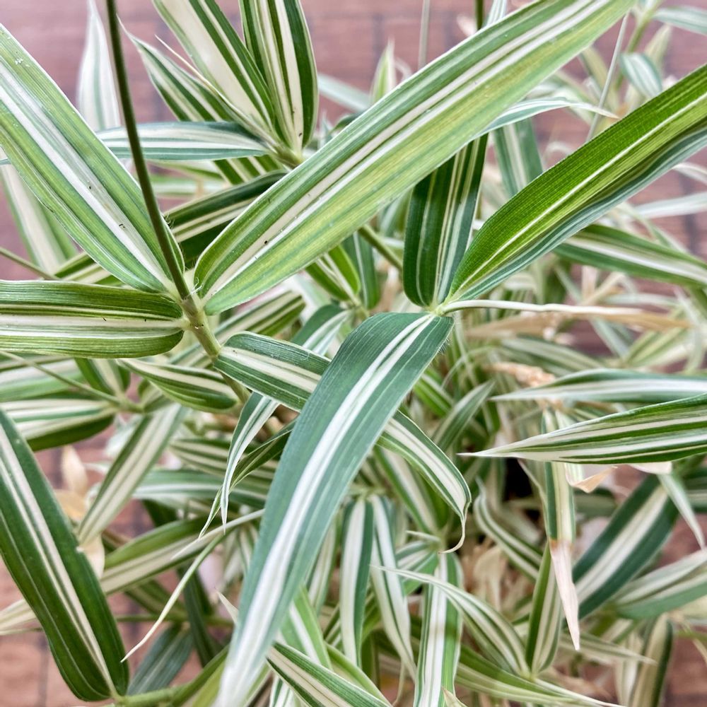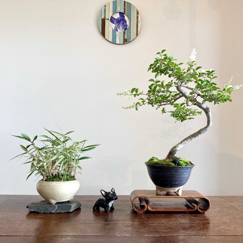 Flowers have bloomed on The privet tree (27cm tall). Next to it is Chigozasa. Fresh striped leaves have started to grow.