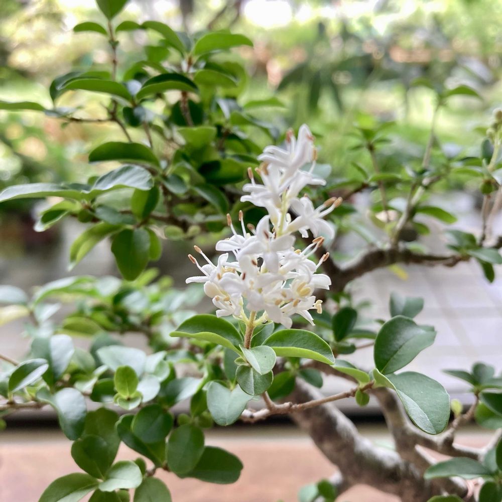 イボタの木(樹高27cm)に花が咲きました。隣は稚児笹です。縞模様の爽やかな葉が伸びてきました。