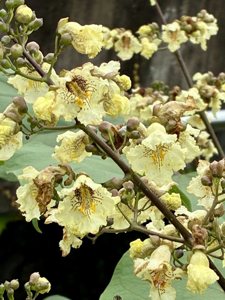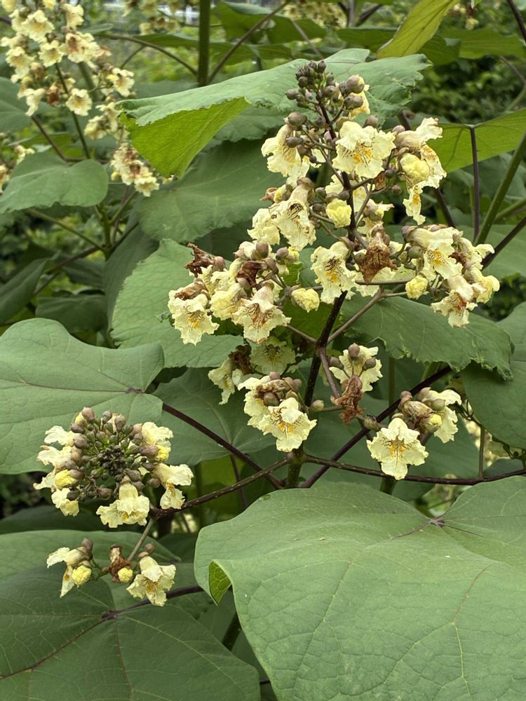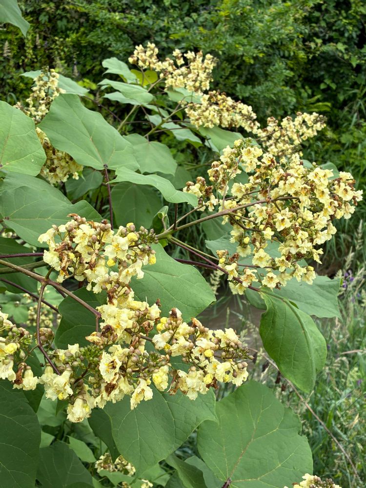 川のどてに桐の花に似た黄色い花がさいてました^ ^🌼。