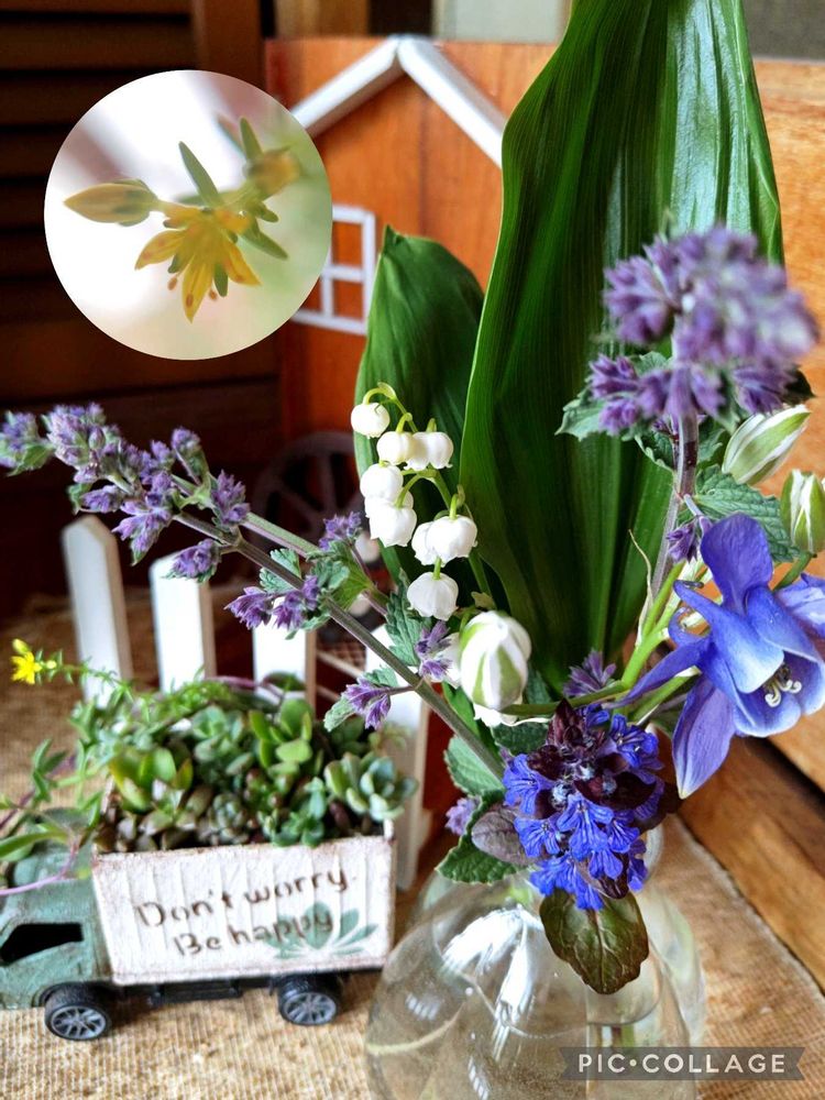 すずらん🤍アジュガ💜キャットミント💜ミヤマオダマキ💜オーニソガラム🤍生けてみました😌