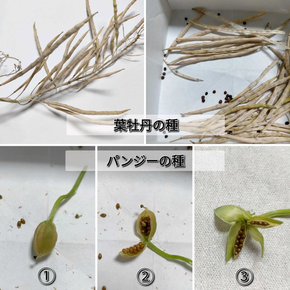 【1枚目】最近、上段画像の葉牡丹の種が熟し始めました。うちはここまでカサカサしてきたら採取しますが、この状態で雨に濡れると種さやの中で発根してしまうので、雨の日の前に収穫するか軒下管理に切り替えます。葉牡丹は少し水っぽくても種さやのまま乾燥させると追熟してくれるので、ここまでカサカサになる前に採種しても大丈夫かもしれません。