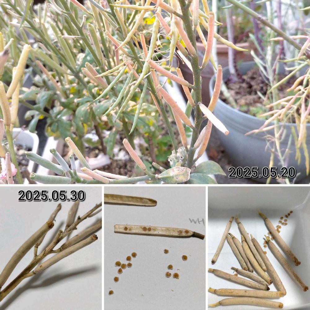 上段は5月20日撮影で、左端の黄色から右の方のオレンジ色っぽく種さやが色変してきました。ストックはこの状態でも未熟なことが多いのでさらに放置。