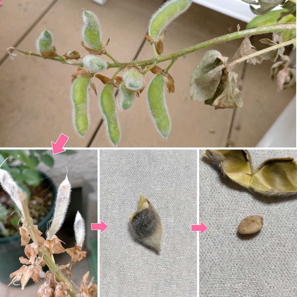 下段は本日撮影で、ここまで茶色くなったのでさやを開いて完熟を確認しました。種さやの水っぽさがなくなったこのタイミングがベストかな☺️