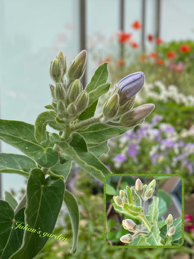 ①3年目の紫陽花「スフレ」の蕾がようやく薄いブルーに色付いてきて綺麗です🩵