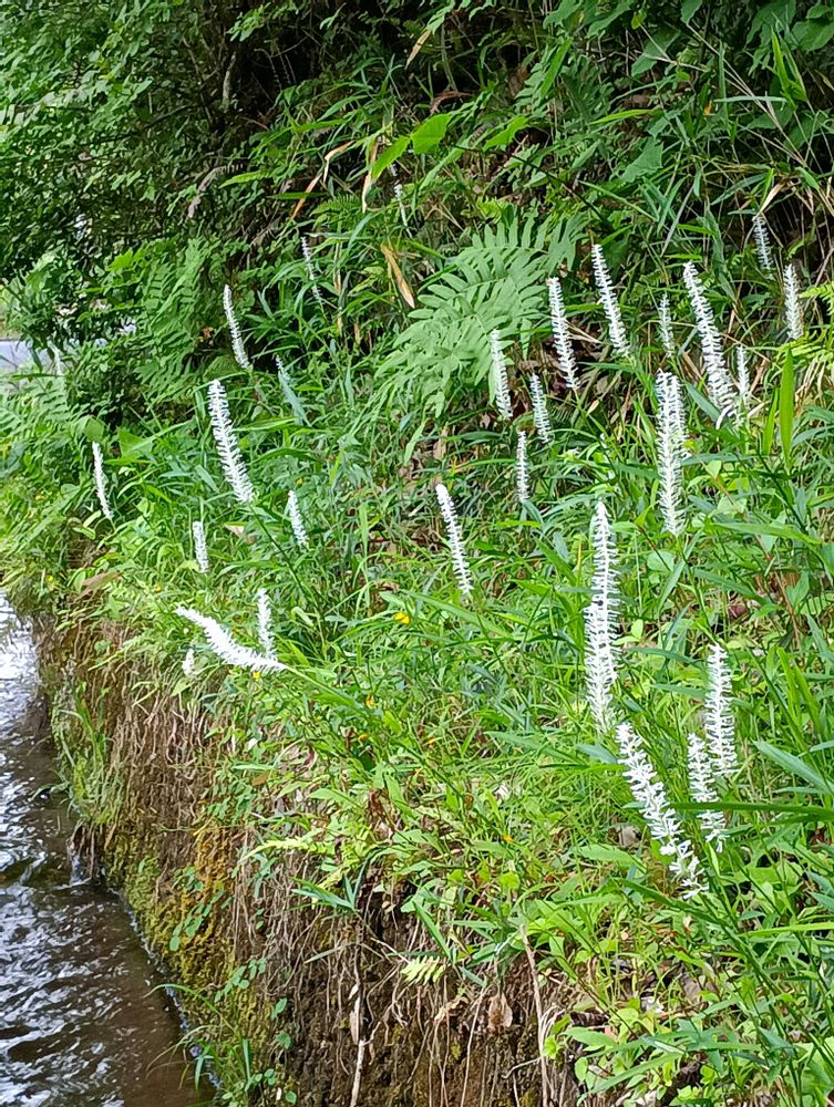 水路を隔てた山側に、ブラシのような白い花が、涼しげに揺れていました。