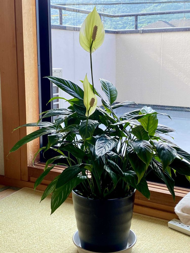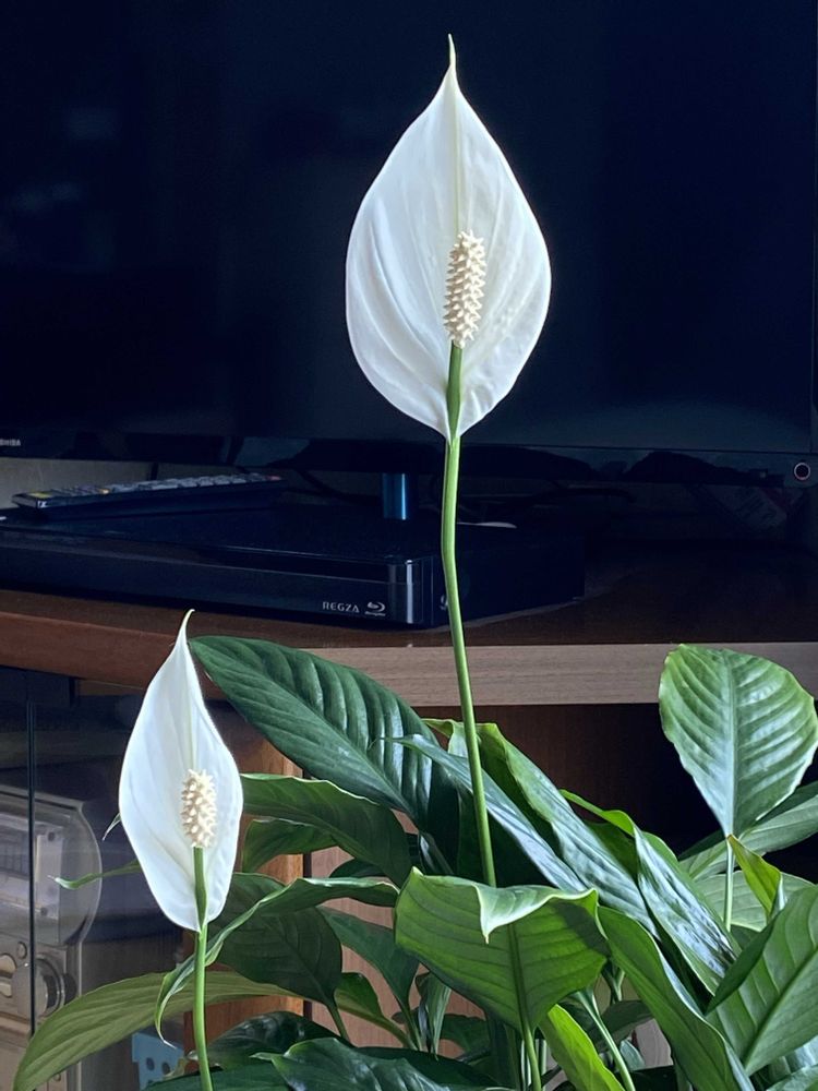 スパティフィラムの花が咲きました。スッと伸びて気持ちいいです。