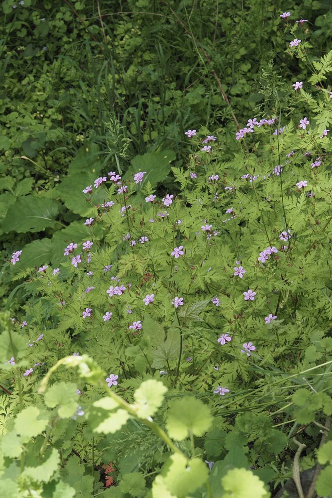 ①②③ヒメフウロ(姫風露)フウロソウ科フウロソウ属の一年草または越年草。『本来は西日本の石灰岩地のみに自生しますが、海外から園芸用として移入したものが多数逸出しており、都市部などで普通に見られます』。外来ヒメフウロでしょう。